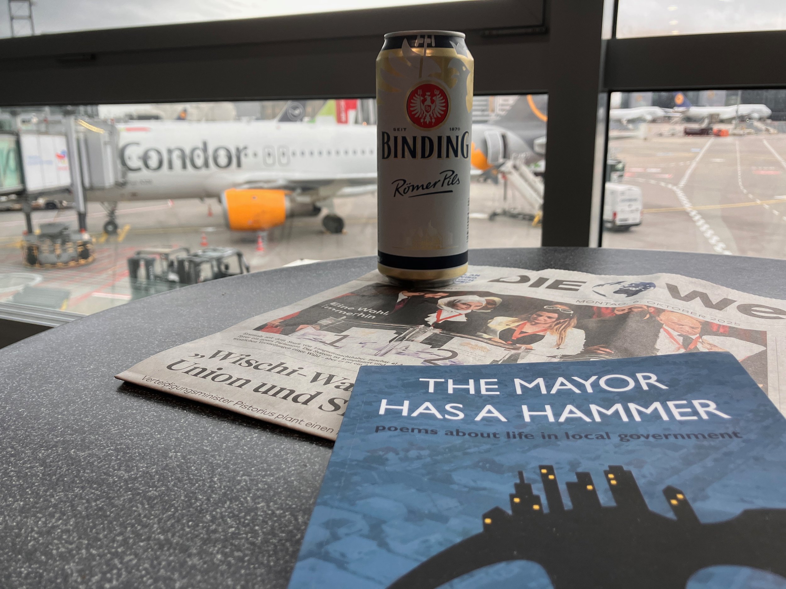 My book enjoys a newspaper and beer in Frankfurt, Germany, while I remain in the US.